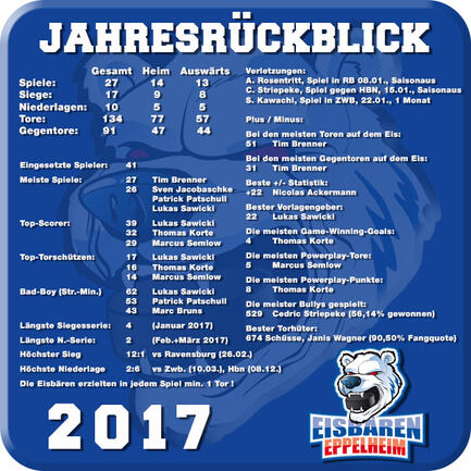 Für das sehr erfolgreiche, abgelaufene Jahr 2017 wollen wir uns dazu noch recht herzlich bei allen bedanken, die den ganzen Verein ehrenamtlich am Laufen halten. Neben dem Team, das Woche für Woche Leistung auf dem Eis bringen muss, sind eine vielzahl an fließigen Helfern, sei es direkt im Umfeld des Spiels, oder aber in der Vor- und Nachbereitung und der Organisation im Hintergrund tätig, ohne die das alles nicht möglich wäre.