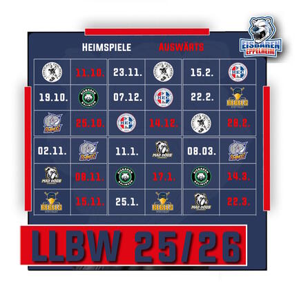 Das ging jetzt fix - der offizielle LLBW Spielplan steht. Wie vorab informiert starten wir am 11. Oktober in Esslingen in die Saison, als letztes Spiel steht das 3. Derby bei den Mad Dogs (1b) an. Die Auslosung hat ergeben, dass wir neben Esslingen auch nach Balingen und zu den Mad Dogs doppelt reisen, während wir Stuttgart, Heilbronn sowie Hügelsheim jeweils doppelt im Icehouse empfangen. Bis zum 11. Oktober werden wir noch Vorbereitungsspiele bestreiten, über die wir noch informieren. Zudem ist für das WE 28./29. März das Finalspiel im die Meisterschaft terminiert, welches im Regelfall der Hauptrunden-Erste ausrichtet und dabei den Zweiten zu einem End-Spiel empfängt.