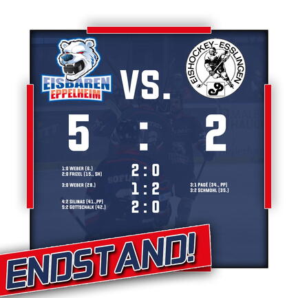 Mit einem hart erkämpften Heimsieg über den Tabellennachbarn Esslingen haben die Eisbären den zweiten Tabellenplatz errungen. Die erwartet defensivstarken Gäste machten es den Eisbären schwer, die nach Toren von Max Weber (2), Artemij Frizel, Avgustinas Silinas und Roman Gottschalk erst im letzten Drittel den Sack mit dem 5:2 zumachen und so nach Punkten mit dem Tabellenführer gleichziehen konnten.
