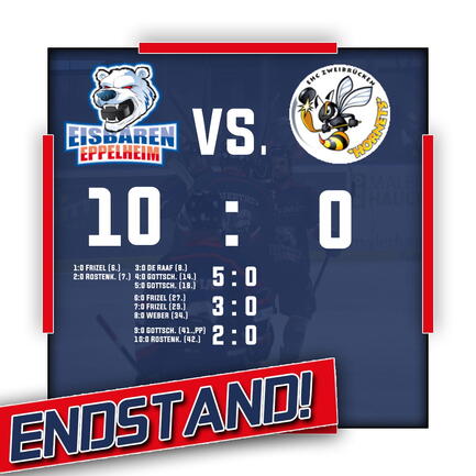 Mit einem glatten 10:0 Kantersieg sind die Eisbären ins neue Jahr gestartet. Gegen das Schlusslicht war es die erwartet einseitige Begegnung, die die Eisbären durch Frizel (3), Gottschalk (3), Rostenkowski (2), De Raaf und Weber zum Abschluss der Hinrunde erneut zweistellig gestalten konnten.
